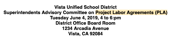 On June 4, 2019, the Vista Unified School District will hold a "Superintendents Advisory Committee on Project Labor Agreements (PLAs)" meeting from 4:00 pm to 6:00 pm at the District Office Board Room, 1234 Arcadia Avenue in Vista. This meeting has not been announced to the public, as far as we know.